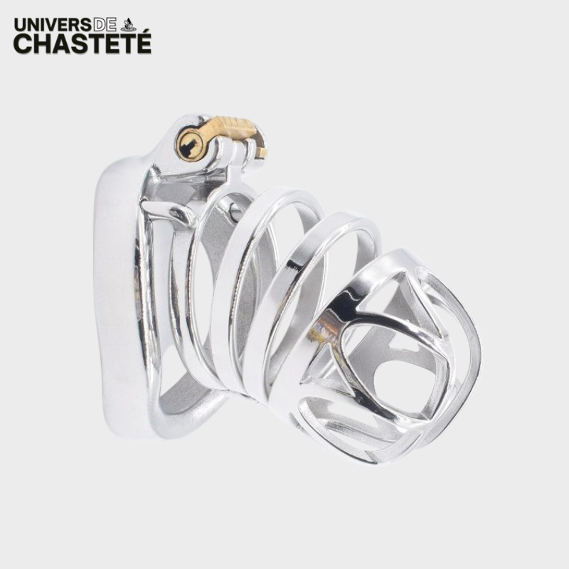 磨かれた金属の仕上げが、このケージを真の宝石のように輝かせ、あなたの服従の輝きを映し出します。