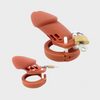 リングと鍵が付いたブラウンシリコン製貞操ケージの角度からの画像